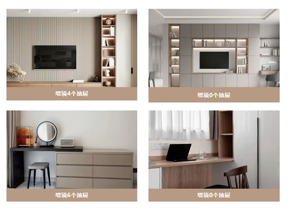 抽屉标配三节轨或托底轨,标配多少,补差价算清楚。书桌、梳妆台、西厨、餐边柜、电视柜等易产生数量增项,差价一般几千+。